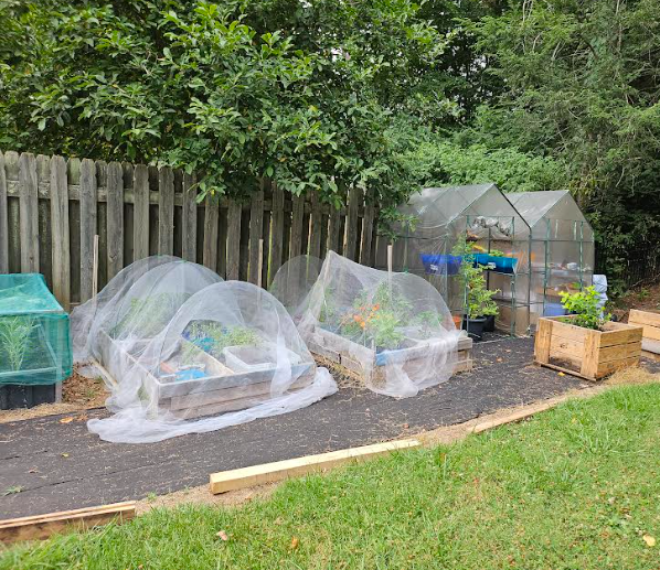From left to right: I started with one small greenhouse in my backyard. Then I transitioned to two small greenhouses with a few raised beds. This summer I grew corn and collards, and a host of other vegetables including parsley, bell peppers, oregano, onions, watermelon, lemon balm, kale, carrots, and more. Then we added some chickens to the family! Currently the garden is in the process of being cleared out and cleaned up.